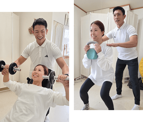 「The筋トレ」のようなゴリゴリのマシンをほとんど使用せず、ご自身の身体の感覚を大切にした内容ですので、身体の変化とともに動けるようになるのを実感いただいています。